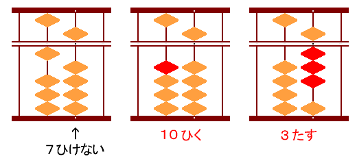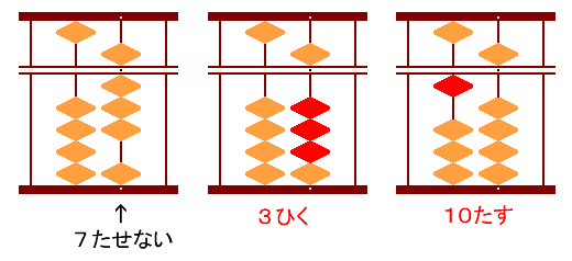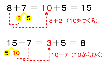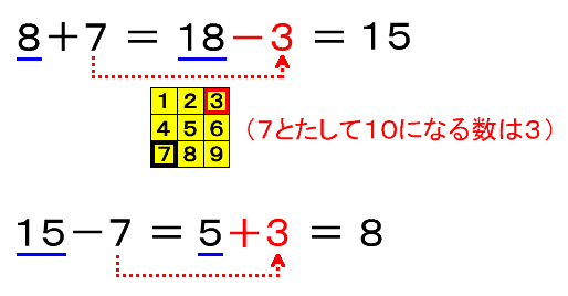 8+7=15(たせない 7 は、3 ひいて、10 をたす。)