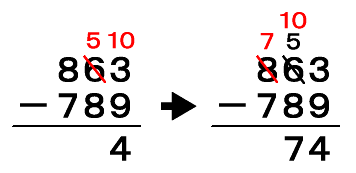 大きい桁から1桁ずつ計算していきます。このとき、計算する桁の右の桁(1つ小さい桁)もチラッと見て、 くり上がりやくり下がりがあるかないかだけチェックしておきます。