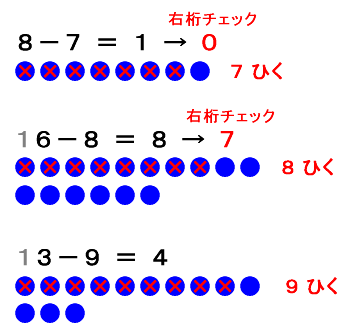 右桁チェックで、くり下がりがあるときは、計算している桁で 1 をひきます。