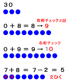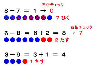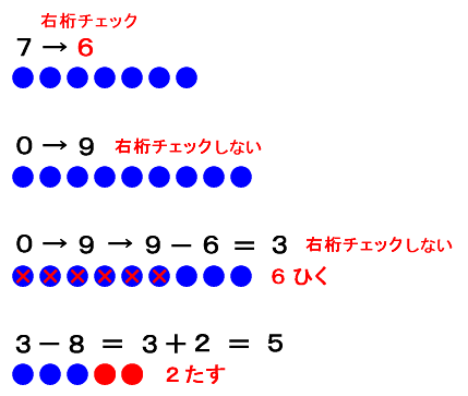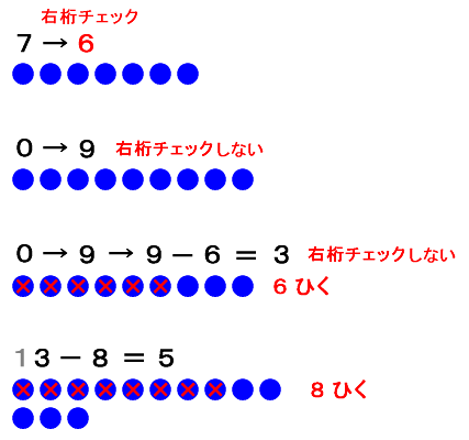 右桁チェックのとき、筆算と同じように、飛びこされた 0 は 9 になります。また、9 になった 0 は、右桁チェックをしません。