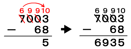 10 をかりてくるとき、飛びこされた 0 は 9 になります。
