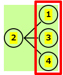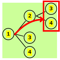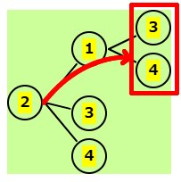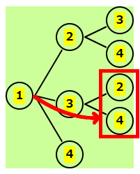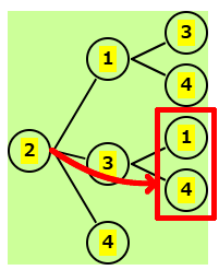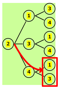 | 残りは、1,3,4 | 2-1の後、残りは 3,4 | 2-3の後、残りは 1,4 | 2-4の後、残りは 1,3 |
