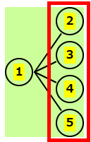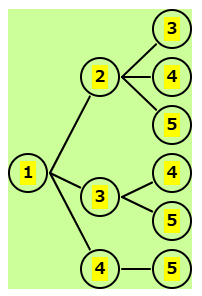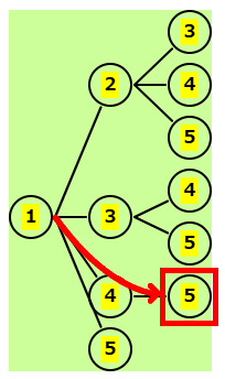 | 残りは 2,3,4,5 | 1-2の後、残りは 3,4,5 | 1-3の後、残りは 4,5 | 1-4の後、残りは 5 | 1-5の後はないので、正解は下の図 |