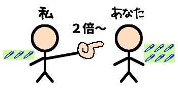 「あなたのペンは、私の2倍です。」と言うときは、私から見て、あなたのペンの数は2倍だ、ということです。