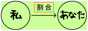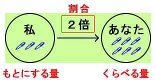 このとき、私(基準となるもの)を「もとにする量」、あなた(注目しているもの)を「くらべる量」、私から見て、あなたが何倍あるのかを「割合」、といいます。