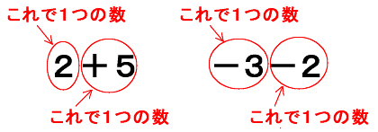 問題解説数の見かたと計算のやり方まずは、かっこをすべてはずします。あとは、符号と数字で一つの数と見て、すべてたし算します。2+5 のようなときは、わざわざ「+5」を「プラス5」としなくても、算数のときの「たす5」でOKです。「+」や「-」は...