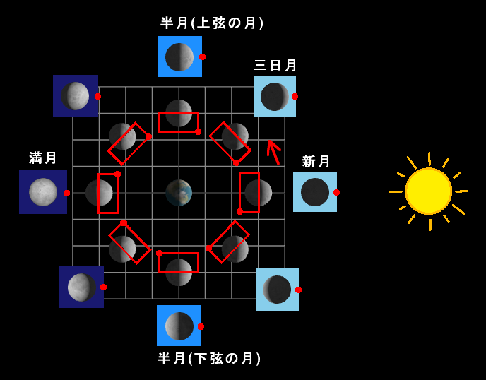 満月は、右側から欠けていきながら新月にもどります。