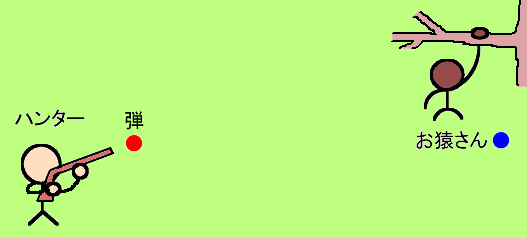 ジャングルの中でハンターが、木の枝にぶら下がっている1匹のお猿さんを見つけました。ハンターが銃を撃つと同時に、お猿さんは手を離して木から落ちていきます。落ちていくお猿さんを仕留めるには、最初に銃をどこに向けて撃てばよいか、という昔からある物理の問題です(現実なら動物虐待ですね)。答えはシンプルで、最初からお猿さんをねらえばいい、ということです。その理由を、ここでは、銃の弾を赤玉、お猿さんを青玉として、考えてみましょう。